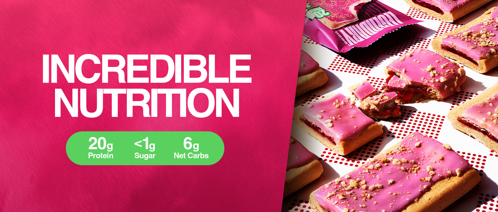 Image with bold text “INCREDIBLE NUTRITION.” Below, three icons read: “20g Protein,” “1g Sugar or less,” and “4–6g Net Carbs or less.” Right side features pink pastries with red filling, broken open to reveal texture. Mobile version of “INCREDIBLE NUTRITION” text in bold white on pink. Below it lists: “20g Protein,” “1g Sugar or less,” and “4–6g Net Carbs or less.” Right side shows pink-frosted pastries with red filling, one broken apart.