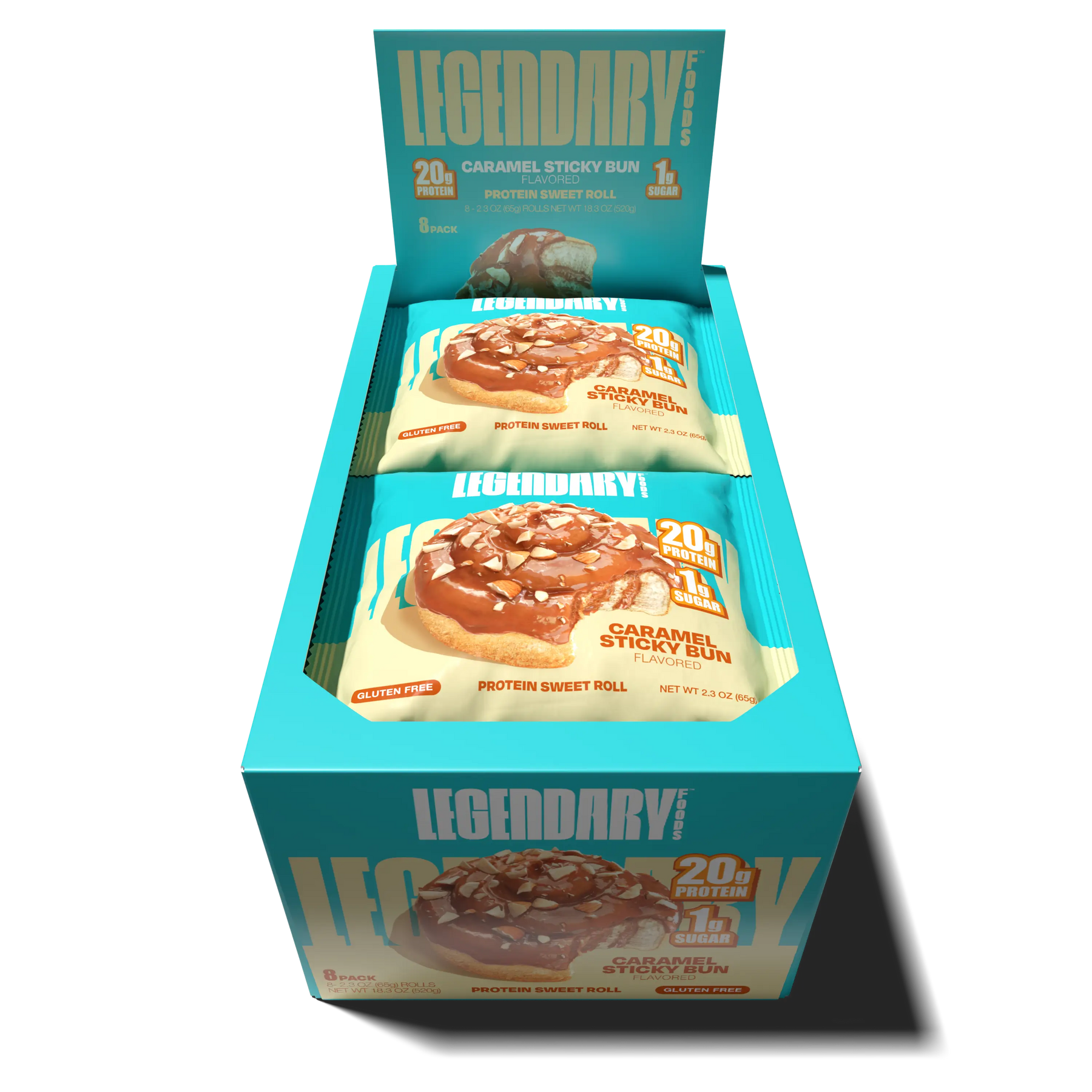 Top down view of an open box of Legendary Foods Caramel Sticky Bun Protein Sweet Roll