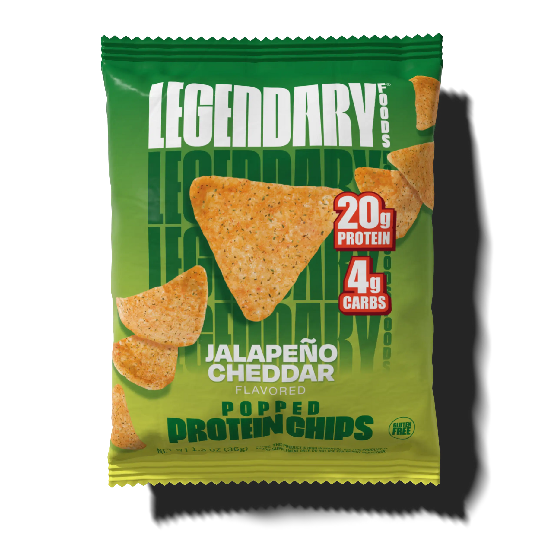 Every bag of Legendary Protein Chips packs 20g of protein, 2g of sugar or less, and only 3-4g net carbs (varies slightly by flavor).