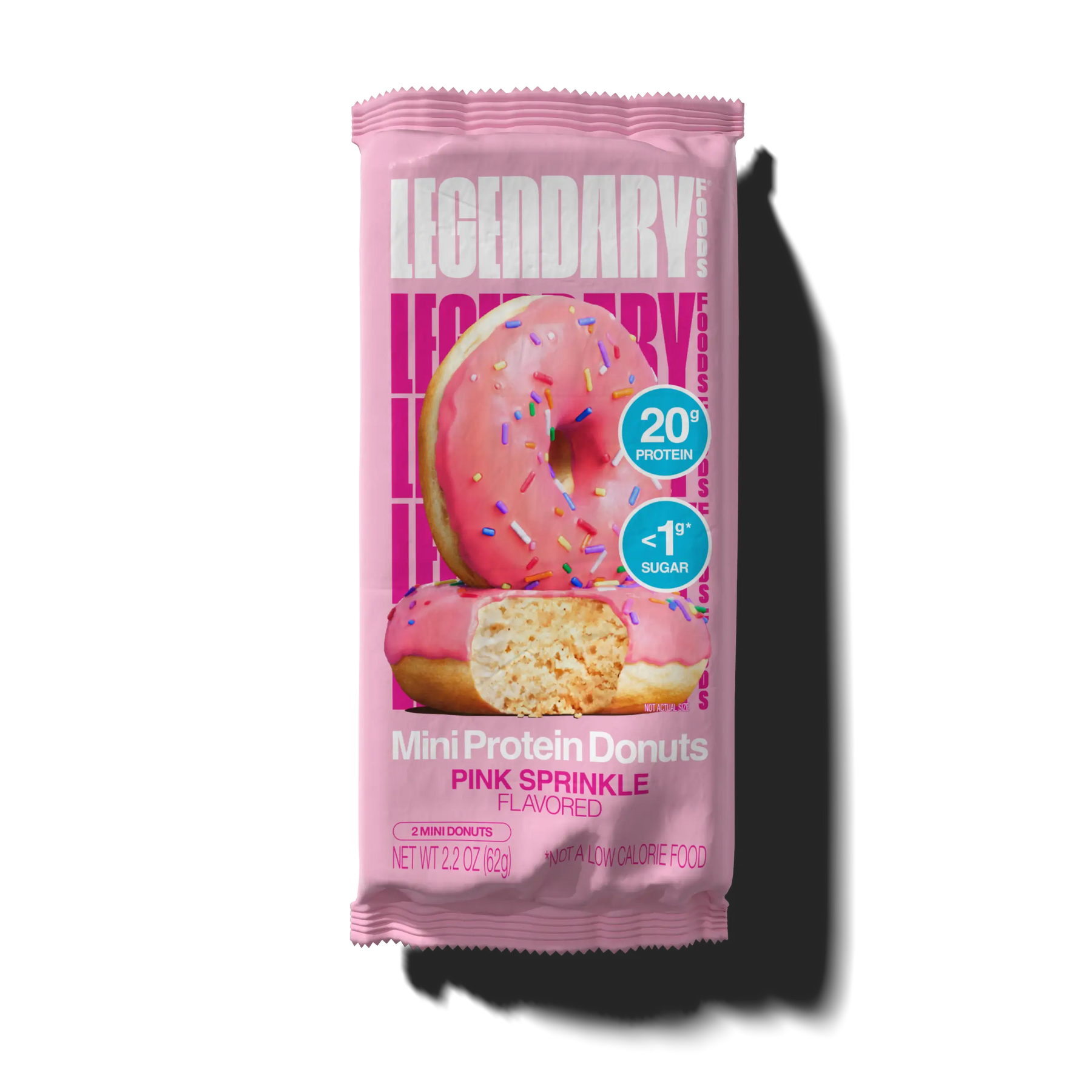 Pink Sprinkle Protein Donut nutrition label with 160 calories, 20g protein, 0g sugar, and 5g net carbs. Full ingredients listed at right.